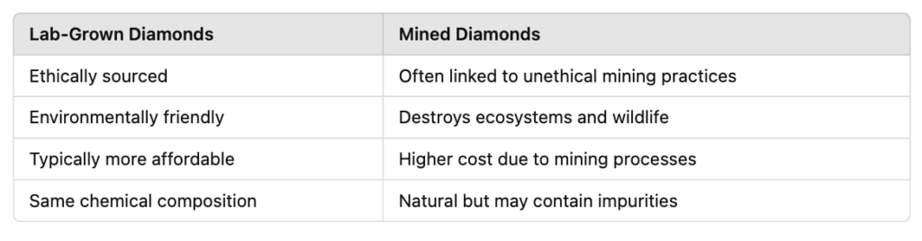 Understand the key differences between lab-grown diamonds and mined diamonds, both visually identical and chemically the same, yet different in sourcing and environmental impact.